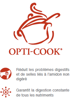 Les formules doivent être cuites différemment selon les ingrédients utilisés afin d’assurer une cuisson parfaite de ceux-ci. Une attention particulière doit être portée sur la quantité et le type d’amidon dans les formules. Un excellent exemple concernant le fonctionnement de cette technologie est le débat entourant la présence de maïs dans la nourriture pour animaux. Le maïs en lui-même n’est pas un mauvais ingrédient pour les animaux, mais il pourrait l’être s’il n’est pas suffisamment cuit. Le maïs a mauvaise réputation car trop souvent celui-ci n’est pas cuit correctement ce qui, peut causer des troubles digestifs chez l’animal. Opti-Cook® permet d’éviter ce problème en cuisant chacun des ingrédients au degré « optimal ».